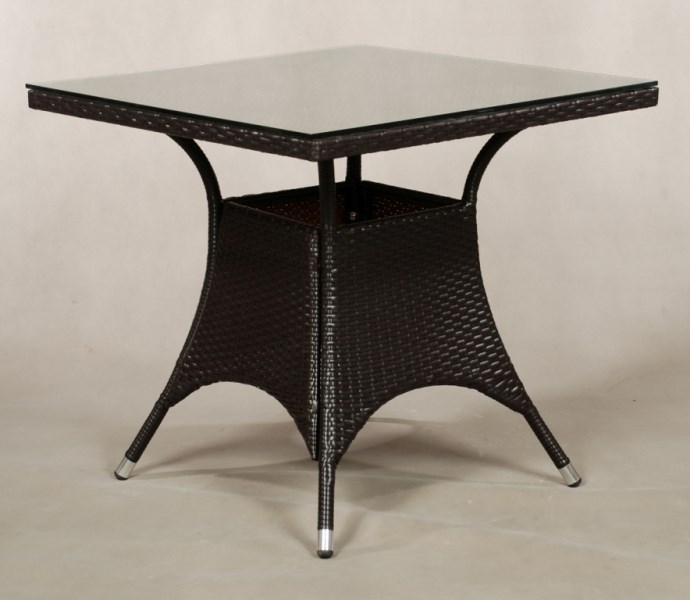 Стол из искусственного ротанга на алюминиевом каркасе. Цвет искусственного ротанга - венге Столешница закрыта закалённым прозрачным стеклом толщиной 8 мм. Каркас из алюминиевого профиля с толщиной стенки 1,2мм. Квадратная столешница со сторонами 80см. Высота стола 74см. Модель может экслуатироваться вне помещений.